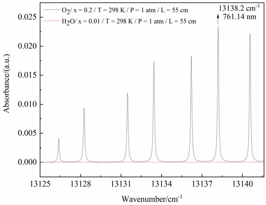 O2 has many absorption lines around 760 nm [37]. According to the HITRAN 2020 database [38], the absorption spectra of O2 and water vapor near 760 nm (13,125–13,142 cm−1) were simulated under particular conditions (, T = 298 K, P = 1 atm, L = 55 cm), as shown in Figure 2. It is clearly shown that the absorption line at 13,138.2 cm−1 is the strongest line of O2 in the range, and there was almost no absorption for water vapor. Therefore, a diode laser (Eagleyard, EYP–DFB–0760) emission at the center wavelength of 761.14 nm was chosen as the laser source in this paper.
