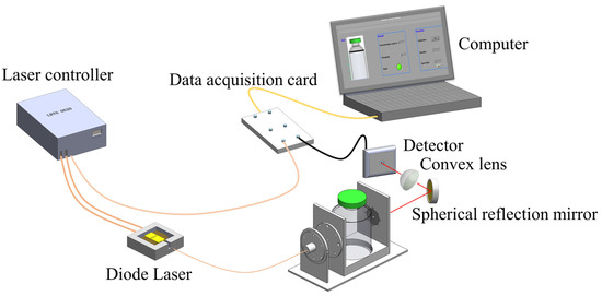 Because the reflected light from different surfaces (such as the collimating lens and vial walls) can interfere with the measurement, it can lead to a complex pattern intensity of the Fabry–Pérot fringes, leading to optical noise [34,35,36]. Therefore, in this paper, the angle of the base was set to 8°, with the light incident at an angle of about 8° relative to the wall of the vial in order to suppress the optical noise of the etalon effects. It should be noted that the whole long–optical–path multi–pass cell is nitrogen purged in order to eliminate the influence of O2 in the ambient air.