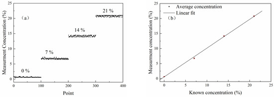 (a) O2 concentration values measured in four standard vials, the dots represent 100 measurement results for each known concentration; (b) measured average concentration values and the relationship of known concentration values.