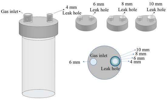 The sensor was used to further investigate the variation in the O2 concentration in the headspace of the vials at different leakage degrees. For convenient processing, metal caps with leakage hole diameters of 4, 6, 8, and 10 mm were designed and processed. And they were sealed with sealant to prevent gas from escaping and causing measurement errors, as shown in Figure 6.