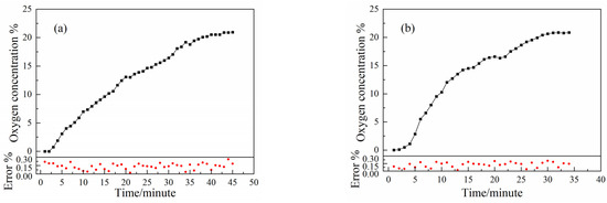The sealed vial was placed on the base of the multi–pass cell with the gas inlet connected to the gas mixer through a gas conduit and the leakage hole sealed with a hemi–spherical nut. The mass flow controller passed N2 with 99.999% purity into the gas mixer and introduced N2 into the vial through the gas conduit. After the gas filled the vial, the inlet valve was closed and left to stand for one minute to prevent the flow of gas in the vial from causing measurement errors in the system. The headspace O2 concentration of the vial was measured by the novel HOCM sensor. The time zero point is the moment when the system starts the measurement. Additionally, the headspace O2 concentration of the vial was continuously measured to study the stability of the headspace O2 concentration before the leakage hole was opened. After two minutes, the leakage hole was opened to analyze the variation in the headspace O2 concentration in the vial with time until it was equal to the atmospheric O2 concentration. Then, the O2 concentration variation in the headspace of the vial with time was analyzed by using different leakage hole diameters. Figure 7 shows the variation in the O2 concentration in the vial with time for different leakage hole diameters every minute. The measurement error is also depicted.