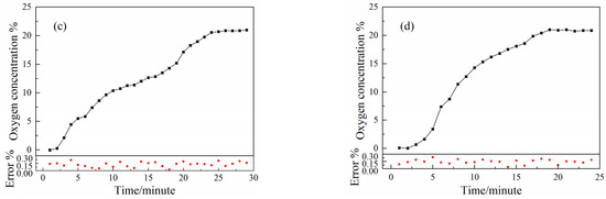 The variation in the O2 concentration with time after opening the leakage hole with different diameters, and the red dots indicate the measurement error: (a) 4 mm, (b) 6 mm, (c) 8 mm, and (d) 10 mm.