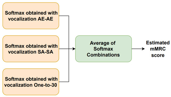 Figure 1 shows the block diagram of the system presented here. Each type of vocalization provided a four dimension softmax, representing the probability of each mMRC score. These three phonetization dependent softmax were combined with the following five rules, generating five new softmax: minimum, maximum, mean, median, and product. These five outputs were averaged to generate the final softmax, where the estimated mMRC score corresponds with the highest probability.