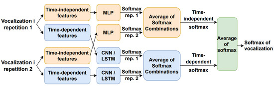 Figure 2 shows how the vocalization dependent scores were obtained. There were two classifiers per type of phonetization, one that received the time-dependent features and another one for the time-independent parameters. Each type of vocalization was repeated twice by the individuals. After extracting the time-dependent and time-independent features, they were propagated through the corresponding machine learning module that outputs softmax per each repetition and kind of parameter. The time-dependent features employed a CNN- or LSTM-based architecture, and the time-independent parameters made use of an MLP scheme. The resulting time-dependent and independent softmax delivered by each repetition were combined separately, using the same scheme described above (Figure 1), with five combination rules, to obtain a single softmax per feature type. Thereafter, the time-dependent and -independent feature softmax were combined by a simple average to deliver the vocalization dependent softmax. This process was replicated for each type of vocalization to deliver the estimated mMRC score, as shown in Figure 1.