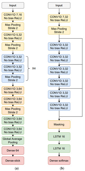 In the case of the time-dependent features, the following configurations were tested: number of FFT samples, i.e., 128, 256, 512, and 1024; window length, i.e., 128, 256, and 512 samples; bandwidth from the first FFT bin, i.e., 25%, 50%, 75%, and 100% of the FFT bins; FFT log spectrum vs. Mel filter log energy; and, with or without delta and delta–delta features. The window overlap was made equal to 50% and the number of Mel filters was 14. Regarding the time-dependent feature neural networks, a more exhaustive optimizations was carried out: 1D CNN convolutional networks, i.e., kernel size (3, 5, or 7), numbers of filters (16, 32, 64, or 128), and number of convolutional layers (3, 6, 10, or 14); max pooling blocks; residual connections; LSTM or BiLSTM, i.e., number of layers and dimensionality; as well as the use of neuron stick-breaking. As depicted in Figure 3a, two convolutional layers plus max pooling was considered as a single block, which in turn was replicated a number of times that it was tuned. A final output, fully connected block, was also optimized by tuning: number of layers, i.e., one, two, or three; and, number of neurons per layer, i.e., 16, 32, 64, 128, or 256. The output of the fully connected block was composed of four softmax nodes, corresponding to the four mMRC scores or classes.