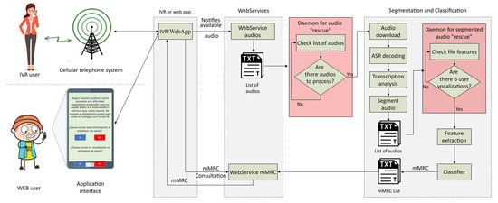 A platform was designed and implemented to record the database. It was used to test the proposed system in real-time. Figure 4 shows the deployed infrastructure, where users can record their vocalizations with a telephone call (i.e., with a IVR server) or using the phone with a web-based application, despite the fact that the results presented here were obtained with speech data recorded with the IVR server only. The audio recorded by each individual is stored in the cloud, and notifies the web service when it is available. A daemon process checks if there is audio to be processed. If so, it is downloaded and segmented with ASR technology to remove background noise or spurious signals, such as other people´s speech, audio from TV or radio sets, etc. After ASR segmentation, the features are extracted and processed with the neural-network-based systems to deliver the estimated mMRC score, which in turn is returned to the user by making use of the IVR or web-based application servers. In the database base recording mode, no mMRC score is returned to the user.