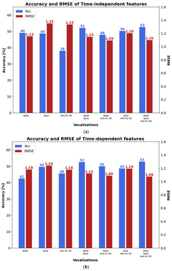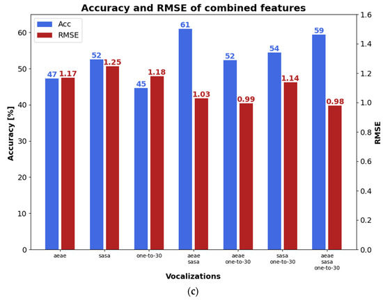 According to Figure 5a, where the results with time-independent features are presented, the highest accuracy (blue bars) corresponds to the combination of the classifiers provided by the three types of phonetizations, i.e., 53%. The worst accuracy is delivered by the one-to-thirty counting, i.e., 38%. This outcome is corroborated when the /ae-ae/ and /sa-sa/ classifiers are combined, giving an accuracy almost as high as the best one, i.e., 52%. This result may suggest that the time-independent features give a slight increase in accuracy, reaching a maximum of 53% when using the three types of phonetizations. Note, the combination of classifier outputs will be denoted with ⊕. The lowest RMSE’s (red bars) are obtained with /ae-ae/⊕/sa-sa/⊕one-to-thirty counting or with/ae-ae/⊕one-to-thirty counting. Moreover, the time-dependent features provided a lower score dispersion depending on the phonetization classifier fusions, but the highest accuracy and the lowest RMSE also occurred when the scores from the three phonetizations were combined, as depicted in Figure 5b, i.e., /ae-ae/⊕/sa-sa/⊕one-to-thirty counting. When the output of the time-independent and time-dependent classifiers are combined (Figure 5c), the highest accuracies took place with /ae-ae/⊕/sa-sa/ and with /ae-ae/⊕/sa-sa/⊕one-to-thirty counting, which are 16% and 12% higher, respectively, than those obtained with time-independent or time-dependent features using the same classifier combination. Similarly, the lowest RMSE occurred with/ae-ae/⊕/sa-sa/⊕one-to-thirty counting, which in turn is 9% and 11% lower, than those obtained with time-independent or time-dependent features, respectively, using the same classifier combination.