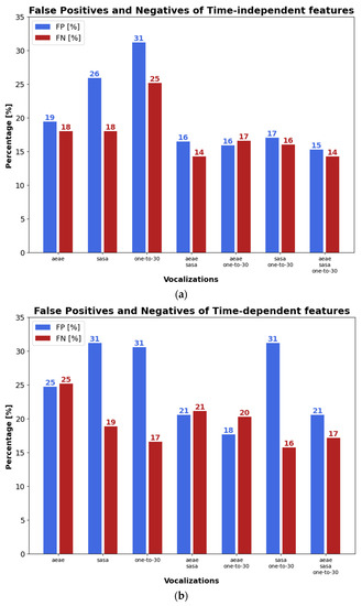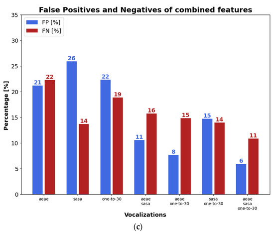 Figure 6a–c depicts FP and FN with time-independent and time-dependent features, and the combination of both types of parameters, respectively. As can be seen in Figure 6a–c, the score fusion provided by more than one phonetization usually gave lower FP and FN than single vocalizations. In addition, the lowest average FN + FP across the three subplots took place with the fusion of the three types of phonetization, which were 36%, 37%, 42%, 15%, 10%, and 23% lower than the average FN + FP with /ae-ae/, /sa-sa/, one-to-thirty counting, /ae-ae/⊕/sa-sa/, /ae-ae/⊕one-to-thirty counting, and/sa-sa/⊕one-to-thirty counting, respectively. Moreover, when time-dependent and time-independent features are used in Figure 6c, average FN+FP with /ae-ae/⊕/sa-sa/⊕one-to-thirty counting were 61%, 58%, 59%, 36%, 26%, and 42% lower than FN+FP obtained with /ae-ae/, /sa-sa/, one-to-thirty counting, /ae-ae/⊕/sa-sa/, /ae-ae/⊕one-to-thirty counting, and/sa-sa/⊕one-to-thirty counting, respectively.