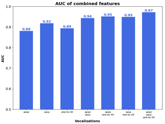 Figure 7 shows AUC with the different combinations of vocalizations, when using both the time-dependent and time-independent features. The results with AUC are similar to those in Figure 5 and Figure 6. The best results were achieved when using the combination of phonetization classifiers. The combination of the three vocalizations gave the highest AUC, which were 10%, 6%, 9%, 3%, 2%, and 2% higher than those obtained with /ae-ae/, /sa-sa/, one-to-thirty counting, /ae-ae/⊕/sa-sa/, /ae-ae/⊕one-to-thirty counting, and/sa-sa/⊕one-to-thirty counting, respectively.