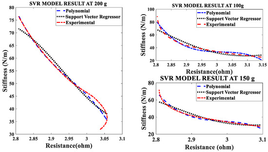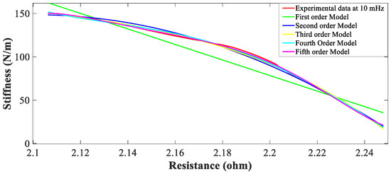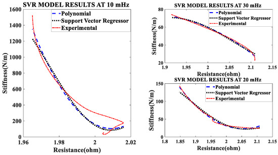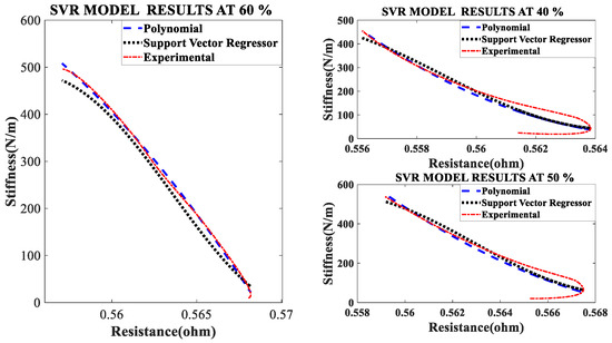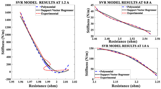 In the first set of experiments, the SMA spring is electrically heated by a 1/100 Hz square wave signal with a constant duty cycle and constant pre-stress. The current of the heating signal is varied, and the data recorded. The current/electrical power affects both the stiffness and resistance of the SMA spring actuator. The effect of changing current is clearly seen in Figure 3. Stiffness-resistance heating characteristics are modeled by the SVR and Nonlinear regression. Figure 3 reveal, that as electrical current increases, the slope of the curve increases, and the experimental characteristics overlap the modeled characteristics. The implementation of both models is done in MATLAB by “polyfit”, “polyval” and other built-in functions.