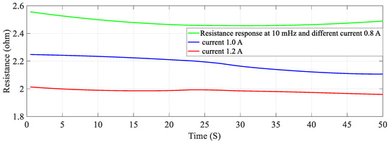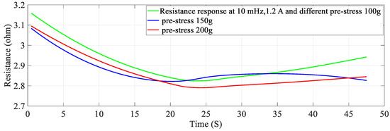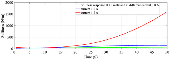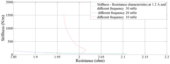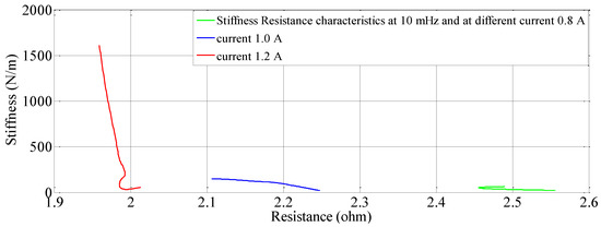 So, the initial value of displacement of SMC is assumed to be zero and it is set to zero in the transducers and recorded in the personal computer. This modeling is aimed at the self-sensing phenomenon when the SMA is under variable stiffness actuation i.e., not particularly on the modeling of the basic actuation or shape memory effect or phase transformation of SMA. Moreover, the study is based on the SMA being activated by joule heating, whereby it is controlled by different electrical parameters such as current, frequency and duty cycle and, pre-stress. The change in resistance corresponding to the change in stiffness is determined during the heating phase, and the relation is extracted as a nonlinear regression model and validated by different metrics through experimentation. The model is valid for the joule heating current of 0.7 A to 1.2 A. Figure 3 shows the stiffness characteristics at 0.8 A, 1.0 A and 1.2 A which is when the phase change starts before which the SMA does not display any linear response. But then after 1.5 A, the response is more linear in characteristic as seen in Figure 3 and also at a current 1.0 A and 1.2 A, respectively. The model and experimental response are compared in the heating cycle when work is completed, specifically between 0.7 A and 1.2 A also, wherein a large change in stiffness and resistance is revealed.