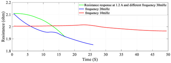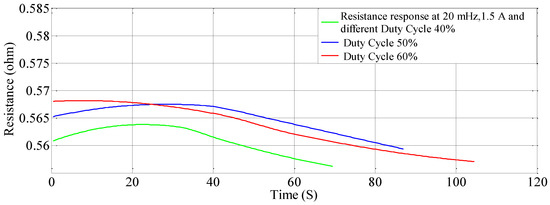 The recorded instantaneous value is used to determine the resistance and stiffness properties of SMC by use of Equations (6) and (7) for the aforementioned activation currents. In the second set of experiments, the switching frequency of the power transistor is changed e.g., 10 mHz, 20 mHz and 30 mHz by ensuring that all other parameters such as activation current, pre-stress on the SMC and duty cycle of the switching frequency are constant. The instantaneous values of the SMA spring’s properties in terms of voltages is continuously recorded in the memory of personal computer via DAQ card. These recorded voltages are converted into proper units of the properties of SMC such as force, displacement, temperature, resistance, and stiffness.