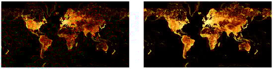 A study on the activity of its members has shown that approximately 1.2 million nodes and 130,000 paths are added daily [22]. Especially in metropolitan regions, a large amount of building data has been added recently. Figure 1 shows a comparison between the node density maps for 2014 and 2022 [23]. Here, a lighter color means a higher node density, whereas darker color means a lower node density.