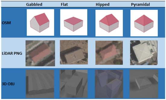 In Section 1.2, we introduced CNNs as a type of neural network used in deep learning to classify images. In the particular case of this work, a CNN was implemented using the YOLOv7 repository [39], which is a version of CNN optimized for object detection in images and video in real time that is very fast, accurate, and easy to implement [40,41]. For this reason, we used CNN YOLOV7 in the experiments carried out in this work for classification of roofs for reconstructing the buildings by processing LiDAR data. Specifically, we tested whether YOLOv7 was able to recognize different roof shapes according to the roof classification provided by the OSM catalog [42]. Particularly, YOLOv7 was tested with gabled, flat, hipped, and pyramidal roofs. Figure 5 shows a comparison of the schematic view provided by OSM, the real view provided by LiDAR, and the view of the reconstructed buildings as 3D objects for each type of roof. Other roof types such as gambrel, round, and round–flat were used to train the neural network, though in smaller proportions than the former roof types.