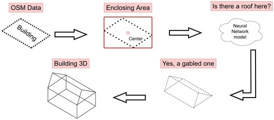 The main goal of training the YOLOv7 CNN was to generate a model able to correctly classify the roofs of buildings contained in a raster image constructed from LiDAR data. It should be noted that while the network had labels for all of the different types of roofs supported by OSM, only gabled, flat, hipped, and pyramidal roofs were supported in 3D rendering. With the correct classification of roofs, it was possible to reconstruct buildings by following the steps described below: