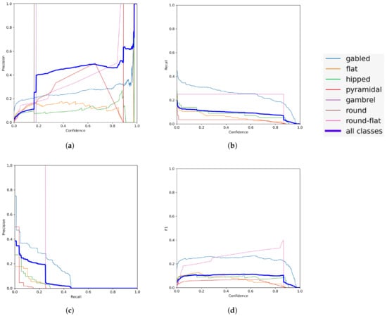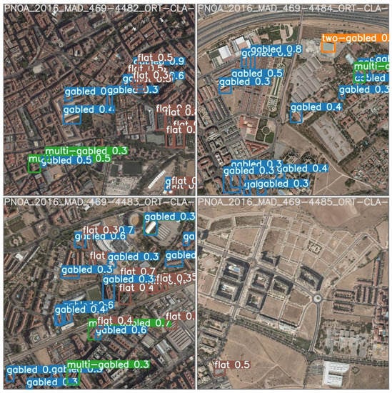 Although the set seems small, favorable practical results were obtained, mainly due to the fact that rooftops in other urban areas not found in the original training and validation image set could be inferred. Before commenting on these results, the metrics presented in the methodology and provided by YOLOv7, namely, precision, recall, mAP, and F1 [45], are discussed.