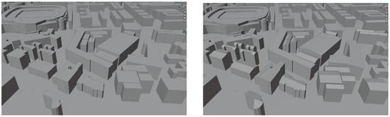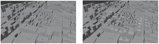 Finally, in Figure 9, an urban area, close to El Paseo de la Castellana in Madrid, can be seen. In the left part of this figure, the buildings are displayed without roofs. This is because the trained neural network was not used to process this image in the reconstruction system. In the right part of the figure, the same urban area can be appreciated with added roofs. In this case, the output of the neural network has been integrated into the reconstruction system, allowing inference as to the type of roof as well as its location in the urban plan.