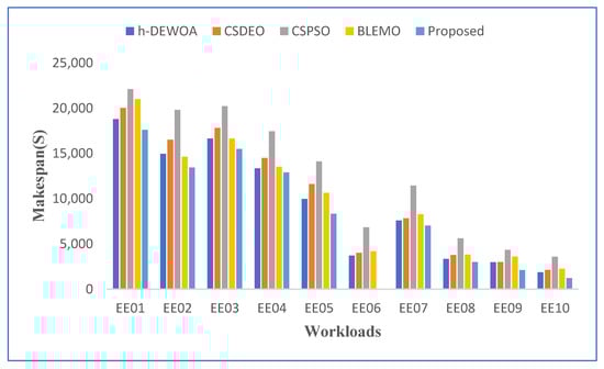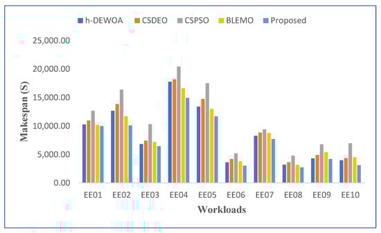 The graphical representation of the best makespan results for all scheduling strategies is shown in Figure 6 and was obtained by running the EE01–EE10 workloads of the HPC2N trace. The graph makes it clear that, out of all scheduling strategies, the proposed technique leads to the lowest makespan findings. It provides compelling evidence of the proposed scheme’s stability and robustness. The worst outcomes, which include unanticipated terrible behavior, are produced by other meta-heuristic techniques such as CSPSO and BLEMO, which are notably different from the others. However, compared to these methods, the h-DEWOA meta-heuristic produced better results.