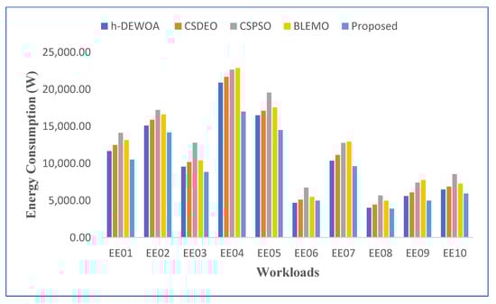 A comparison based on energy consumption is shown in Figure 4. The proposed method uses the least amount of energy across all workloads, as would be predicted. H-DEWOA and BLEMO achieve comparable energy usage in all workloads, whereas CSPSO and CSDEO perform poorly in the majority of workloads. The proposed approach achieves significantly more energy consumption on the EE02 and EE05 workloads as contrasted to all other workloads. However, it uses the least amount of energy when compared to existing methods. The CSPSO performs poorly on the EE04 and EE05 tasks, while the CSDEO and H-DEWOA perform similarly. The CSPSO records the highest overall energy use. This further demonstrates how unreliable and ineffective the CSPSO algorithm is. It uses a single homogeneous population, which is the cause of this. Thus, the potential for early convergence is always present.