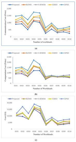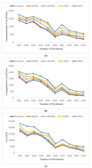 Figure 5 shows the cost of communication, calculation, and overall execution. These figures show that each job has a different total execution cost. The presented EEOA task scheduling algorithm operates better and outperforms the h-DEWOA, CSDEO, CSPSO, and BLEMO task allocation algorithms in terms of minimizing execution costs. The results obtained further demonstrate the scalability and ability of the suggested approach to schedule large jobs in a heterogeneous environment while incurring the minimum execution costs. For EE01 and EE10 workloads, our proposed EEOA algorithm improves the quality of its solutions by allocating tasks to the finest VMs with the lowest execution costs.