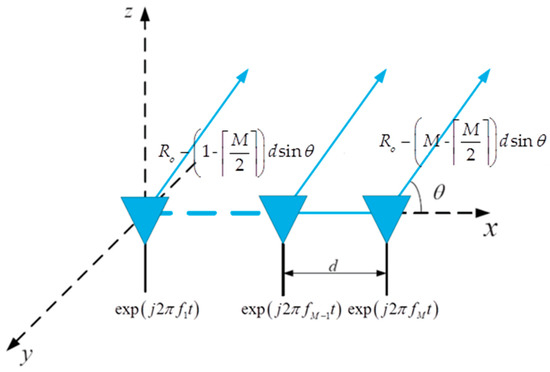 As shown in Figure 1, the antenna of the FDA jammer is a uniform linear array containing elements with spacing . Taking the ( is the round down operator) element as the reference one, the carrier frequency of the waveform radiated from each element of the FDA jammer can be represented as [20]