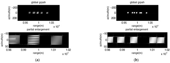 Considering that the imaging area of the target is , it can be easily be covered by a single patch. As the range span of the patch is the same as the azimuth span in the simulation, it is only necessary set the frequency offset parameters to ensure that the range span of the patch is greater than 16 m. According to (34) in Section 3.2, it can concluded that the frequency rate should be greater than . In addition, the patches corresponding to the reference element are shifted back 10 m in the range direction by a tiny time delay to cover the target. The JSR is set as 18 dB