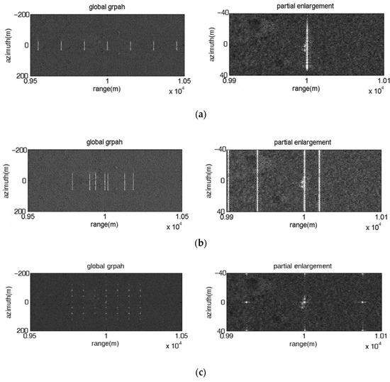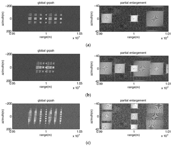 Figure 9 presents the image results of the proposed jamming with fixed frequency offset, where the left subgraphs and the right subgraphs are the global perspective and partial enlargement, respectively. The jammer-to-signal ratio (JSR) is 10 dB. When the azimuth interval of adjacent false targets is smaller than the azimuth resolution (), the jamming effect is present as multiple azimuth-oriented barrage lines located at different range positions as shown in Figure 9a,b; otherwise, the jamming effect is present as a 2-D point false target array, as shown in Figure 9c, where is greater than (). The cover length of multiple false targets or barrage lines along the azimuth is proportional to the modulation amplitude and modulation angular velocity of the micro-motion modulation signal. What needs to be pointed out is that the proposed jamming with fixed frequency offset is not suitable for protecting surface targets such as tanks.