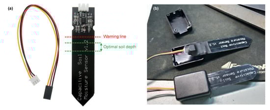 The low acquisition cost of SKU sensors comes with several disadvantages, e.g., they are fragile as their electronic components are exposed to light, heat, and air humidity. This might limit their use to simple tests in laboratory benches and plant pots. The SKU has a required optimal soil contact area (Figure 1a), and since we intended to use it under different environmental conditions, it was necessary to protect the upper part of the sensor to avoid physical damage, short circuit, and oxidation. Thus, this portion of the sensor was waterproofed with enamel, wrapped with heat shrink, protected with a plastic case, and later filled with silicone (Figure 1b).