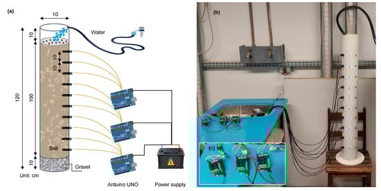 (a) Outline of column tests, (b) infiltration column, and (c) Arduino controllers and shields.