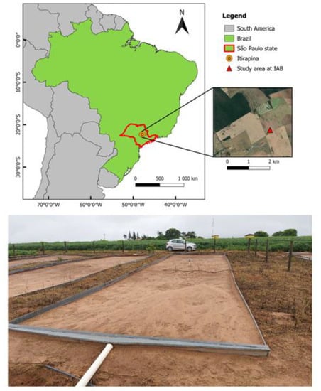 The sensors were tested under field conditions. The tests took place in an experimental 100 m2 field plot (5 m wide by 20 m long) without vegetation cover and delimited with metal sheets approximately 30 cm high (see Figure 4). The plots were installed in 2011 [,,] and surface runoff and erosion have been monitored continuously [,]. The experiment was carried out at Instituto Arruda Botelho (IAB), Itirapina, central region of the State of São Paulo, Brazil (latitude 22°10′ S, longitude 47°52′ W, elevation of 790 m). The region has an average annual rainfall of approximately 1,500 mm, with a rainy season between October and March [] and, according to the Köppen–Geiger classification system, the climate is humid subtropical (Cwa), with hot and rainy summers and cold and dry winters [].