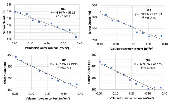 After identifying the power supply (3.3 V) that produced the best correlation between SWC and sensor output, we started the tests to construct the calibration curves. A higher accuracy can be achieved using the individual calibration of each sensor (all sensors with R2 above 0.94). As identified for other sensors in Figure 7, some sensors had difficulties in measuring soil water content above 0.3 m3/m3, while SR1 had similar difficulty below 0.1 m3/m3. A possible explanation for this is that the soil samples were not completely compacted for dry and near-saturation conditions.
