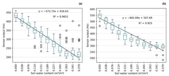 The SKU sensor is part of a set of a generation of open-source hardware developed for operation through low-cost microcontrollers and thus has two power options: 3.3 V and 5.5 V. Figure 6 shows sensor output from one SKU sensor versus soil water content for both input voltages. The sensor output frequencies are highly dependent on the input voltage with higher output for higher voltage. The best fit between sensor output and soil water content was found for the 3.3 V option (R2 = 0.871) compared to the 5.5 V option (R2 = 0.798). While performing these initial tests, we noted different sensor response speeds: when immersed under water, sensors can respond immediately (step type), or gradually (slope type).