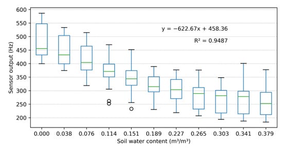 Individual sensor calibration is very time-consuming. To save labor, we tested a simplified calibration based on the average slope of the sensor output-SWC relationship plus sensor output when inserted into dry soil: equal to or below 460 Hz (group 1) or above 460 Hz (group 2), as given in Figure 8. To simplify calibration and provide a better correlation between sensor readings and actual SWC, we developed a universal calibration curve (Figure 9) based on data from 63 sensors. Table 4 comprises statistical metrics comparing the observed and predicted SWC for each calibration method (individual sensor, single-point, and universal). Despite obtaining a satisfactory linear correlation (R2 = 0.949) between known SWC and the sensor output frequency, the response amplitude was very high, especially at the end of the curves (dry and saturated soil), as also found by []. Under saturated conditions, 50% of sensor outputs were within the range between 215 and 295 Hz, wider than the range observed under medium SWC level (0.12 m3/m3), 325 to 370 Hz. Thus, due to the high variability identified for universal and single-point calibration curves, the construction of individual calibration curves is suggested (Figure 7).