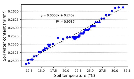 Figure 10 shows the performance of the sensor during the temperature dependency test. The air temperature measured by the thermocouple ranged from 2.7 °C to 32.1 °C while the soil temperature was between 11.8 and 32.3 °C. These values were similar to the range found in the field tests, between 4.2 and 34.3 °C. When the sample cools with the decrease in air temperature, there is an increase in the sensor frequency output. The same pattern of inverse correlation between sensor output and soil temperature occurs when heating the sample. For a temperature change of 20 °C, there was a change in the soil water content of approximately 0.015 m3/m3 meaning 4% of soil saturation spectrum. So even though the temperature dependency is clear, the effects are small.