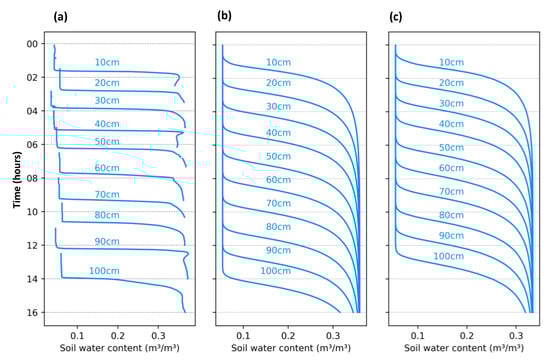 To investigate the sensors’ ability to represent the wetting front arrival in the soil column, we applied the Hydrus-1D package [] for the theoretical representation of water vertical flow. Hydrus is a computational package developed by the Salinity Laboratory of the US Department of Agriculture to simulate the transport of water, solutes, and heat in one, two, or three dimensions in a saturated or unsaturated porous medium. The software uses the finite element method to numerically solve the Richards Equation [] and describe saturated/unsaturated flow. Additionally, it uses the van Genuchten equation [] to describe the soil water retention curve, which relates the potential pressure to the hydraulic conductivity []. For describing the hydraulic conductivity, it uses the equation of Mualem []. The van Genuchten hydraulic parameters ( and ) were estimated using the neural network prediction module Rosetta [] using the granulometric material percentage and bulk density. The upper conditions of the soil profile correspond to atmospheric boundary conditions (BC) under constant incoming water flow, and a lower free drainage. Table 2 contains the input values and conditions used for the parameters while simulating the infiltration process in Hydrus-1D.