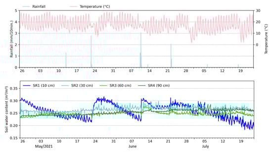 Additional to the seasonal oscillations, we observed daily oscillations occurring at SR1 and in smaller magnitudes at SR2, SR3, and SR4. Due to its proximity to the surface, the water content in the soil is evaporated by solar radiation during the day, while during the night, the lower layers supply moisture to the upper one, restoring the previously measured SWC, creating up- and downward cycles. The oscillations identified can be related to the variation of the air temperature (as described in Figure 10), but with little significance since the depths of the sensors are inversely proportional to the daily oscillations, as also observed by [].