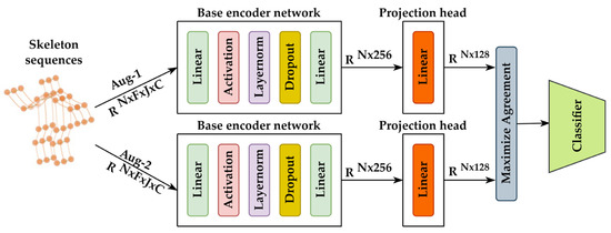 Assume that an input skeleton sequence can be represented as containing T consecutive skeleton frames, where contains coordinates of S subjects with J different 3D body joints. The training dataset consists of N skeleton sequences from different actions, and their views and subjects may be different. Each skeleton sequence corresponds to a label , where , denotes action class, and c is the number of classes. The goal is to learn a set of valid representations by without introducing any labels.