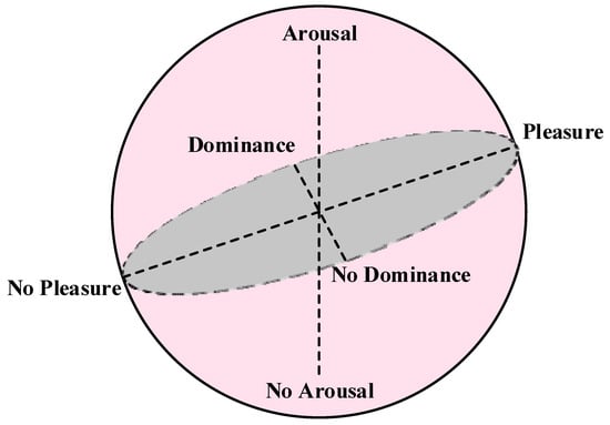The most famous three-dimensional emotion model is the pleasure, arousal, and dominance (PAD) model [23] proposed by Mehrabian and Russell through the study of environmental psychology methods [24] and the feeling-thinking-acting [25] model, as shown in Figure 2 (adapted from [23]).