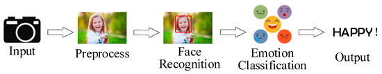 The facial expression recognition process is shown in Figure 3. Facial expressions can intuitively reflect people’s emotions. It is difficult for machines to capture the details of expressions like humans [33]. Facial expressions are easy to hide, which leads to emotion recognition errors [34]. For example, in some social activities, we usually politely smile even though we are not in a happy mood [35].