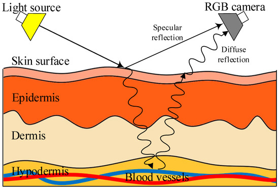 Photoplethysmography (PPG) is an optical technology for the non-invasive detection of various vital signs, which was first proposed in the 1930s [40]. PPG is widely used in the detection of physiological signals in personal portable devices (smart wristbands, smart watches, etc.) [41,42]. The successful application of PPG has led to the rapid development of remote photoplethysmography (rPPG). A multi-wavelength RGB camera is used by rPPG technology to identify minute variations in skin color on the human face caused by changes in blood volume during a heartbeat [43], as shown in Figure 4.