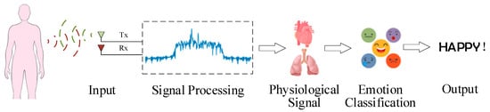 Different emotions will cause a series of physiological responses, such as changes in respiratory rate [63], heart rate [64,65], brain wave [66], blood pressure [67], etc. For example, the excitement caused by happiness, anger, or anxiety can lead to an increased heart rate [68]. Positive emotions can increase respiratory rate, and depressive emotions can tend to inhibit breathing [69]. Respiratory rate also affects heart rate variability (HRV), which decreases when exhaling and increases when inhaling [70]. Currently, radar technology is widely used in remote vital signs detection [71] and wireless sensing [72]. Radar sensors can use the echo signal of the target to analyze the chest micro-motion caused by breathing and heartbeats. It can realize remote acquisition of these physiological signals. The overall process of emotion recognition based on radar sensor is shown in Figure 6.