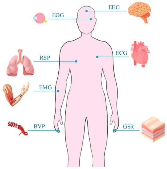 Human emotion is a spontaneous mental state, which is reflected in the physiological changes of the human body and significantly affects our consciousness [76]. Many other physiological signals in the human body, such as electroencephalogram (EEG) [66], electrocardiogram (ECG) [77], electromyogram (EMG) [78], galvanic skin response (GSR) [79], blood volume pulse (BVP) [80], and electrooculography (EOG) [81], as shown in Figure 7.