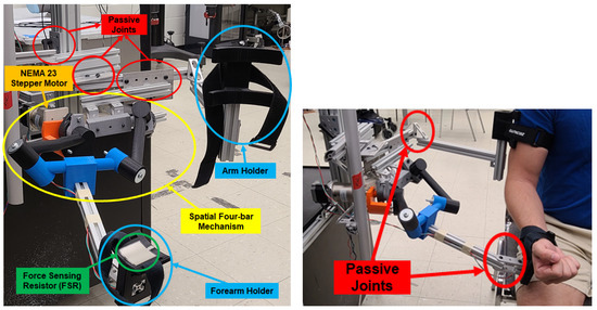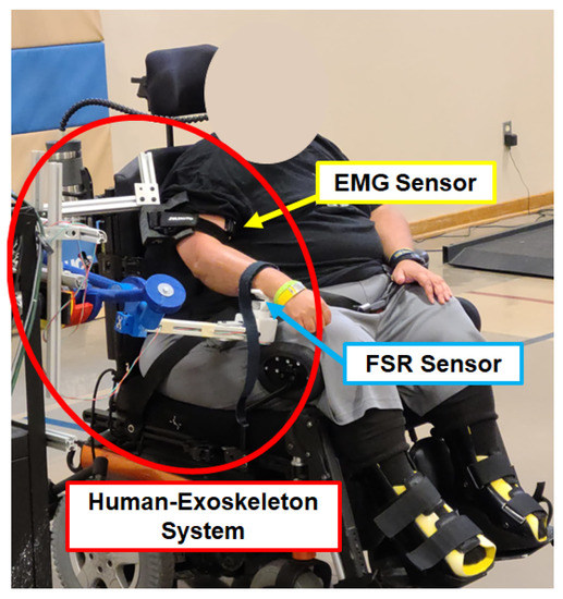 Prior to commencing the experiment, the experimental procedure was comprehensively explained to all participants, and each individual diligently signed the requisite IRB forms. The following step consisted of having two sEMG sensors placed on the participant’s arm, post cleansing the skin using alcohol pads. These sensors were placed specifically on the bicep and tricep muscles. These are the main flexor and extensor of the elbow, respectively. Then, the subjects were asked to sit next to the exoskeleton in order to adjust it to the participant’s anthropometric measurements. The CPRF personnel were responsible for ensuring that the exoskeleton was appropriately aligned and fitted. All necessary adjustments and alignments were accomplished by manipulating the passive joints shown in Figure 3. Once the adjustments were made, the participant’s arm was attached with Velcro to the arm and forearm holders, respectively (Figure 13). The compliant straps were used to accommodate different-sized patients and to constrain unwanted movements at the attachment points. after the patient was attached to the mechanism, they were physically constrained to follow the spatial displacement of the Bennet linkage without being influenced or propelled by the straps. In this stage, the subject was instructed to relax and rest their arm while the exoskeleton executed ten elbow flexion and extension motions at an angular velocity of 20 degrees/s from 0 to 60. This range of motion was set between 0–60 to ensure the safety and maintain consistency in the experimental setup across the subjects since they were wheelchair bound. Upon completion, the AAN algorithm model was trained, and the participant was asked to attempt the remaining number of flexion repetitions. In the event that the participant was incapable of concluding one or more of the repetitions, the exoskeleton would have taken over and accomplished the task on their behalf. Finally, upon completion of the task, the wearer’s arm and forearm were released from the exoskeleton, by carefully removing the Velcro from both places. In addition, the sEMG sensors were also removed.