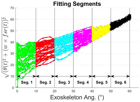 A weighted , Equation (1), was used to create another representation of the distribution of the FSR point cloud. The norm takes into account both the exoskeleton input angle, , and the FSR measurement values. The resulting plot is shown in Figure 9.