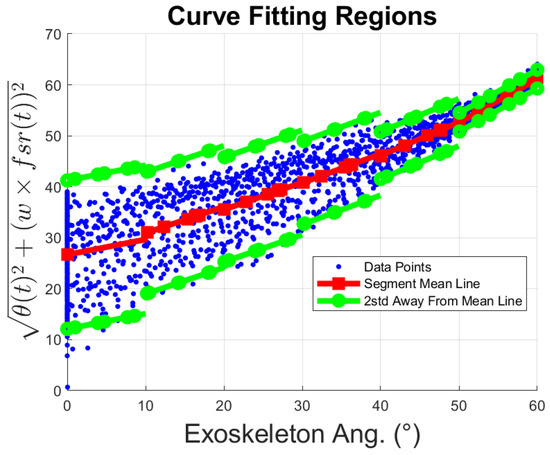 Our goal in this section is to determine a mathematical model that can infer the intention of the wearer using these 3 different regions and drive the exoskeleton accordingly. For this purpose, least-square regression methods are used. To describe the behavior of the resting region, Figure 9, a curve representing the mean of the distribution across different input angles must be determined. Then, lower and upper boundary lines enclosing the resting area are defined by 2 times the standard deviation (std), , away from the mean curve. This process is repeated across n different segments of the distribution, see Figure 10.