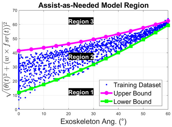 Now, this problem can be solved as expressed in Equation (4), obtaining coefficients for the upper boundary and lower boundary curves, respectively. An example of the resultant boundary curves is presented in Figure 12, where the green curve with square markers is the lower boundary, the magenta curve with dot markers is the upper boundary, and the blue-dot points represent the data used for training this model, the resting region. Then, the information extracted from the FSR measurement and the exoskeleton input angles, , can be classified into 3 different regions. Any point that lies in the first region, region 1, can be interpreted as the user trying to flex the elbow. Similarly, any point in the second region, region 2, is classified as the person resting the arm on the exoskeleton without applying any effort/force. Lastly, any point above the upper boundary curve is classified as the person exerting force against the exoskeleton, region 3. This can be interpreted as the person attempting to extend the forearm.