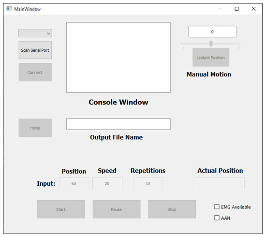 During the experiment, the exoskeleton was controlled by a Python-based Graphical User Interface (GUI), see Figure 14. In this GUI, the range of motion (in degrees), the speed in (degrees/second), and the number of trials to be performed could be specified. In addition, whether sEMG sensors were used and whether the AAN was activated could have also been selected. Furthermore, the exoskeleton could be instantaneously stopped in the event of an emergency by pressing the Stop button.