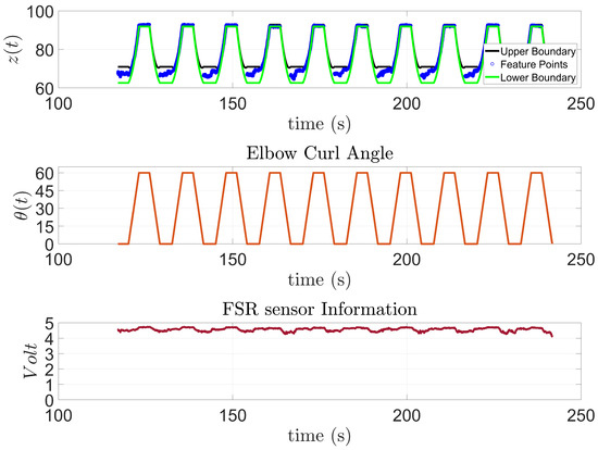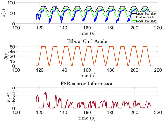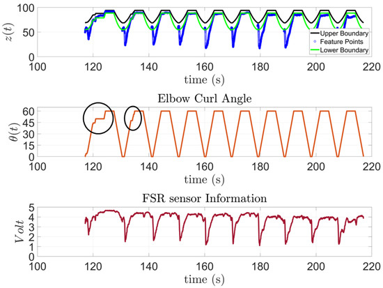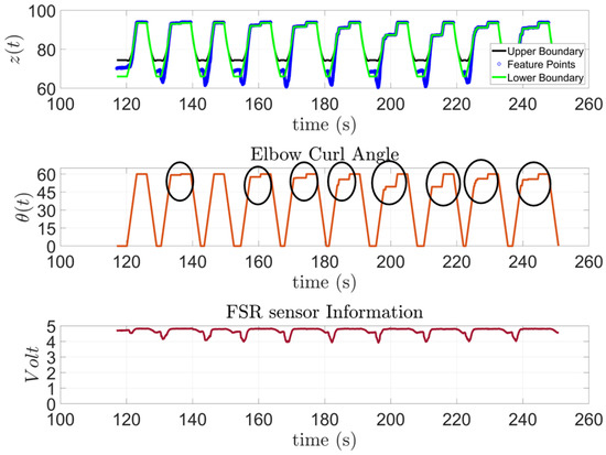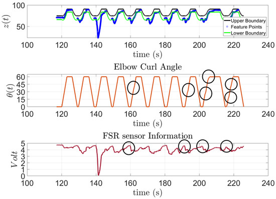 In Figure 15, the model to predict the action of subject one is presented along with the feature points extracted from the FSR sensor and the input angles of the stepper motor for the 10 trials outside the training session. This subject has SCI and has been diagnosed with general atrophy and a limited active range of motion and strength for all joints. The figure shows that the subject was capable of performing the requested task; however, as the exercise progressed, the subject started to experience some difficulties. These moments are highlighted by a black circle on top of the Elbow Curl Angle graph since the exoskeleton stops due to lack of activity from the subject to analyze whether it needs to finish the task for them. Moreover, to demonstrate the correlation of the FSR measurement to the algorithm output, the FSR measurements were added for the subject, see Figure 15.