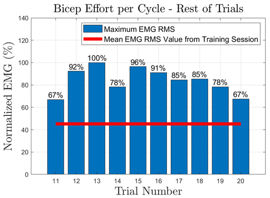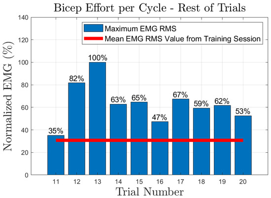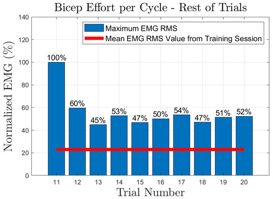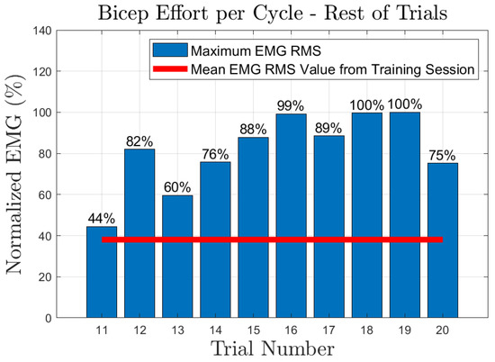 The effort of the bicep muscle for each one of the subjects is presented in Figure 20, Figure 21, Figure 22, Figure 23 and Figure 24. In these figures, a bar plot is used to show the RMS value of each trial sEMG, and a red-colored line is used to indicate the mean value for the RMS of the sEMG signals during the training trials. Subject 1, presented a mean effort for the training session of around 34%, then, the bicep effort started increasing as the subject was applying some torque at the joint to perform the requested elbow-flexion task. The same can be said for the rest of the patients; the only difference among them was the mean sEMG values computed during the training session. One peculiar case that we found in our study is that subject 4 could not perform the task by themselves; however, the patient was able to engage the bicep muscle to produce effort, Figure 23. Therefore, this information could be used to inform the patient of the endurance performance of the bicep during the exercise. This information will keep them motivated to continue the physical-therapy treatment regardless of whether they can finish the exercise or not.