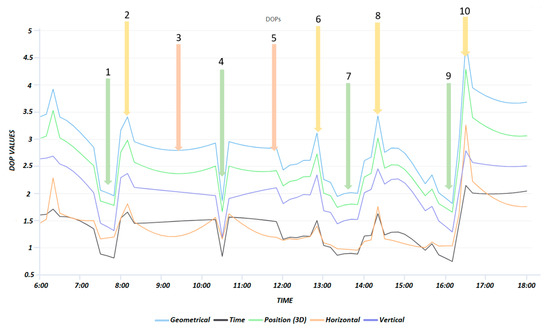 DOPs (Trimble GNSS Planning online) with times of planned observation sessions in the time window 06:00–18:00 CET (14 July 2020). The sessions planned are marked with numbers and arrows.